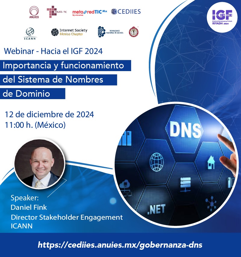 Estimada comunidad, Están cordialmente invitados a participar en el webinar Importancia "Importancia y funcionamiento del DNS" donde tendremos como ponente a Daniel Fink. Director stakeholder engagement of ICANN Este webinar se encuentra dentro de las actividades que se están realizando previamente al IGF 2024 como parte del HUB REMOTO IGF MÉXICO organizado por la Internet Society Capítulo México, el Instituto Tecnológico de Mérida y ANUIES-TIC / CEDIIES. El Hub tendrá como sede el Instituto Tecnológico de Mérida. (MX) con el fin de crear un espacio remoto para que los participantes puedan interactuar y tomar la palabra, si se desea, dentro de las principales conferencias y talleres, logrando que la participación en el IGF 2024 sea más significativa e inclusiva. Día: 11 de diciembre Hora 17 UTC (11hrs MX) Idioma: Español Registro: https://cediies.anuies.mx/gobernanza-dns/ Saludos cordiales Eunice
