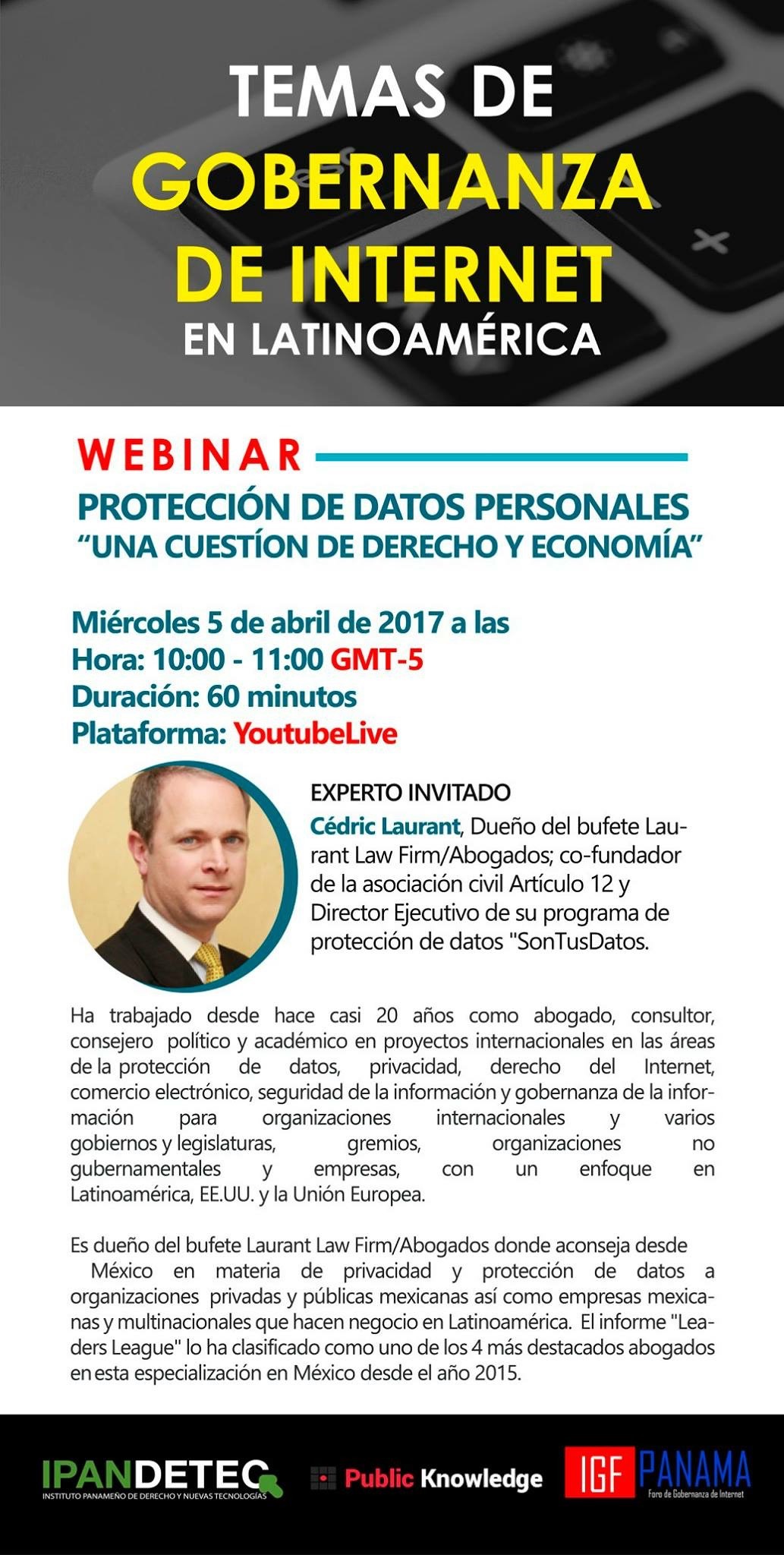 ---------- Forwarded message ---------- From: *Lia Hernández - IPANDETEC* <ipandetec@gmail.com> Date: Tuesday, April 4, 2017 Subject: [RedLatAm] Webinar de Protección de Datos Personales To: "redlatam@lists.accessnow.org" <redlatam@lists.accessnow.org> MAÑANA a GMT-5 webinar online de 1 hora explicando las principales implicaciones de una ley de protección de datos, el cual será dictado a través del canal www.youtube.com/ipandetec para más detalles escribir a ipandetec@gmail.com <javascript:_e(%7B%7D,'cvml','ipandetec@gmail.com');> Gracias a Public Knowledge y SontusDatos - Artículo 12, A.C. - IPANDETEC. Favor difundir, Gracias! -- un cordial saludo, <http://www.facebook.com/ipandetec> <https://www.instagram.com/ipandetec/> <https://www.linkedin.com/company/instituto-paname%C3%B1o-de-derecho-y-nuevas...> <https://twitter.com/ipandetec> <https://www.youtube.com/channel/UCZnaR7Cfk6VK8_ctZi6WEpQ> *Lia Hernández Pérez* *Directora Ejecutiva* *IPANDETEC* T: (507) 308-2487 / 6614-2732 D: Calle Thays Pons, Edificio Elege, Oficina 101, El Cangrejo Panamá (ciudad) W: www.ipandetec.org ************************************************************ ******************************* All information contained, attached and/or displayed in this electronic message may be legally privileged, confidential and for the exclusive use of its intended and authorized recipients. E-mail transmissions are not guaranteed to be secure or error free and sender does not accept liability for such errors or omissions. The company will not accept any liability in respect of communications that violates our e-mail policy.. Toda información contenida, desplegada o adjuntada en este mensaje de correo electrónico, puede ser legalmente privilegiada, confidencial y para el exclusivo, interés y uso del o los recipientes. Las transmisiones electrónicas no garantizan seguridad o errores en ningún momento, por lo que las personas que utilizan éste medio por parte de la empresa no aceptan responsabilidad por tales errores u omisiones. La organización no aceptará bajo ningún concepto, ninguna responsabilidad respecto a las comunicaciones que violen de alguna manera nuestra política de correo electrónico (email).