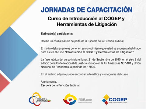 Estimados Lacralo Favor considerar mis disculpas ya que me encuentro a esa misma hora, por dos semanas, en un taller de capacitación con el Consejo Nacional de la Judicatura sobre el nuevo código orgánico general de procesos que cambia radicalmente el sistema de litigación civil en el Ecuador, transformando al anacrónico sistema escrito en uno: 100% oral, público, basado en audiencias y sustentado sobre evidencia o prueba. Gracias por su comprensión. Atte Diego Acosta Bastidas El 22 de septiembre de 2015, 5:43, DIEGO ALFONSO ACOSTA BASTIDAS < dacostabastidas@dtech.ec> escribió: