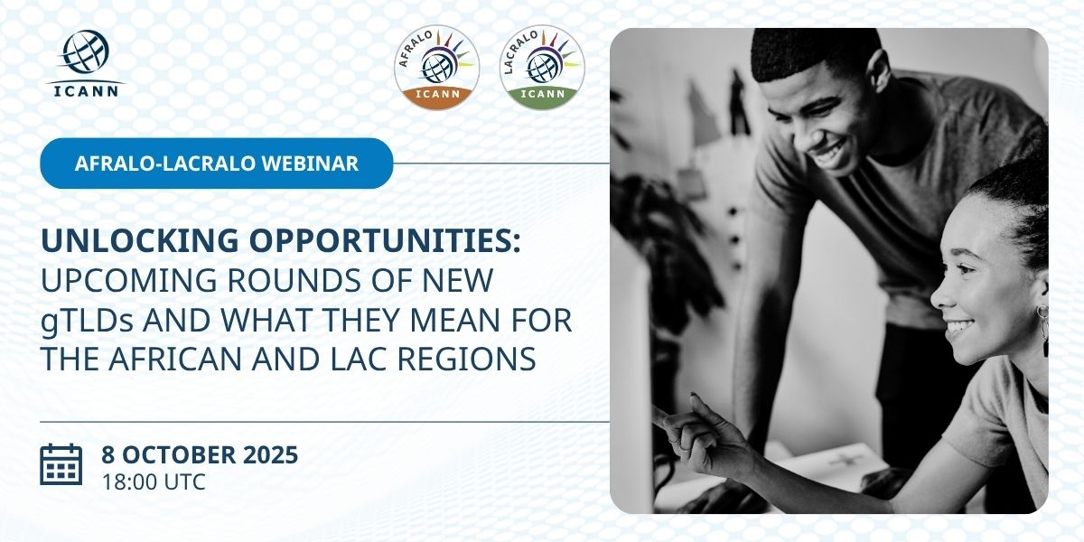 ** Please register and share this invitation amongst your ALSes and members ** Zoom registration: https://icann.zoom.us/webinar/register/WN_AtnYSH9BST2n994MH8pHvg [icann.zoom.us]<https://urldefense.com/v3/__https://icann.zoom.us/webinar/register/WN_AtnYSH...> English, French, Spanish, Arabic and Portuguese interpretation Dear All, Invitation to attend the Joint AFRALO-LACRALO Webinar “Unlocking Opportunities: Upcoming Rounds of New gTLDs and What they mean for the African and LAC Regions” on Wednesday 08 October 2025 from 18:00 – 20:00 UTC. This is meant to be an informative, awareness and educational webinar about the upcoming round of new gTLDs, the Applicant Support Program (ASP) and the assistance provided to create support for the underserved communities. In addition, the webinar will provide regional specific case studies that tell the story of a TLD including its background and business objectives. Agenda (TBC): https://icann-community.atlassian.net/wiki/x/AQATHg [icann-community.atlassian.net]<https://urldefense.com/v3/__https://icann-community.atlassian.net/wiki/x/AQA...> Zoom registration: https://icann.zoom.us/webinar/register/WN_AtnYSH9BST2n994MH8pHvg [icann.zoom.us]<https://urldefense.com/v3/__https://icann.zoom.us/webinar/register/WN_AtnYSH...> Interpretation: English, French, Spanish, Arabic and Portuguese Important: please keep note of the zoom room as you will be sent an unique link. Thank you. Kind regards, At-Large Staff ICANN Policy Staff in support of the At-Large Community www.icann.org<http://www.icann.org/> [cid:f20de501-d393-424f-8f80-5007feae32eb]