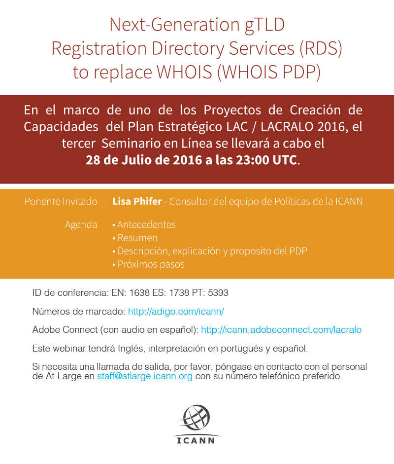 En el marco de uno de los Proyectos de Creación de Capacidades del Plan Estratégico LAC /LACRALO 2016, el tercer Seminario en Línea titulado “*Next-Generation gTLD Registration Directory Services (RDS) to replace WHOIS (WHOIS PDP)* ” se llevará a cabo el 28 de Julio de 2016 a las 23:00 UTC.