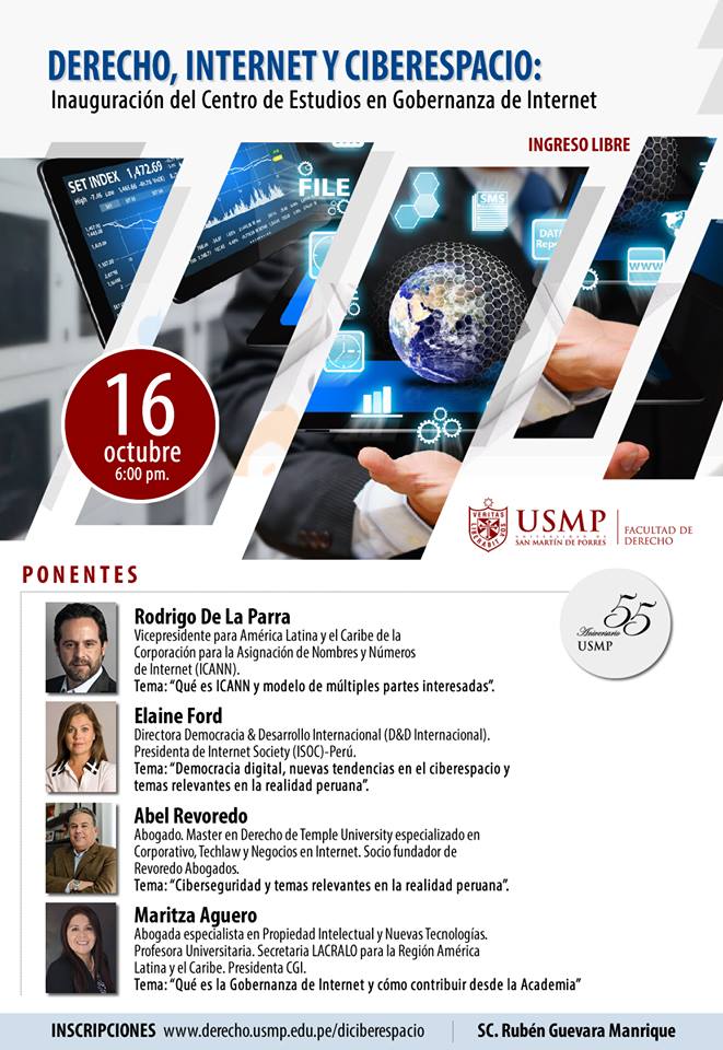 Estimados miembros de la Comunidad, Con mucho agrado, comparto con ustedes el afiche del evento que estamos organizando en la ciudad de Lima para el día 16 de octubre 2017, conjuntamente con una prestigiosa Universidad. Como podrán apreciar del mismo, en dicho evento se inaugurará el Centro de Estudios en Gobernanza de Internet. Prontamente compartiré la información necesaria -debido a que, dentro de los objetivos del Centro, se encuentra la conformación de un Consejo Consultivo Internacional- para que aquellas personas que se encuentren interesadas en contribuir desde la academia puedan hacerlo. Gracias por su atención. Saludos, Maritza