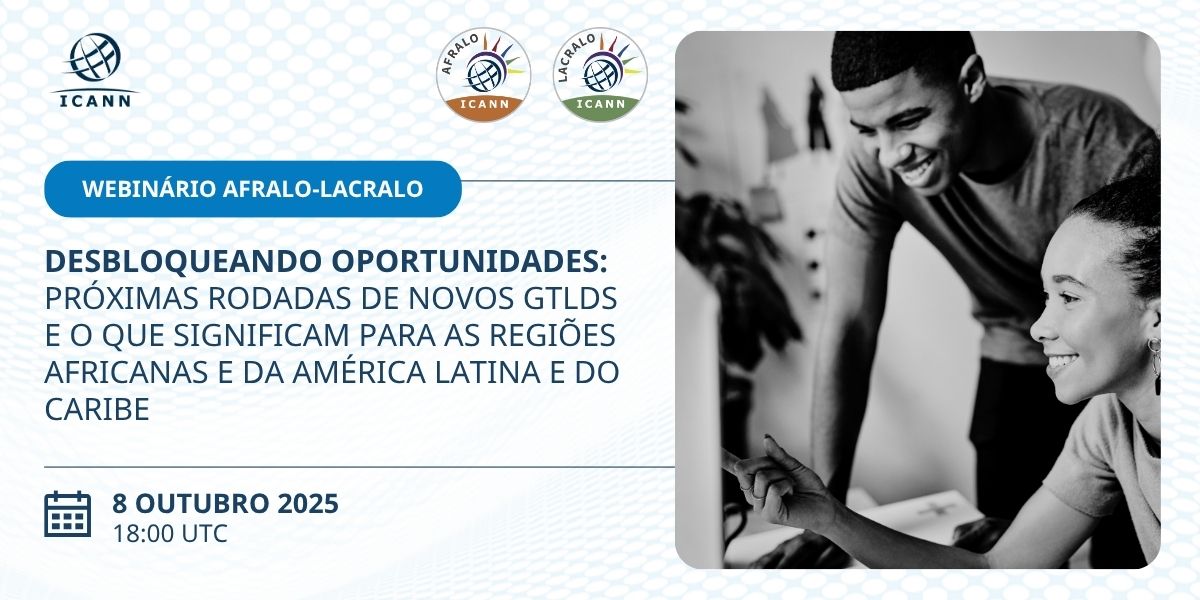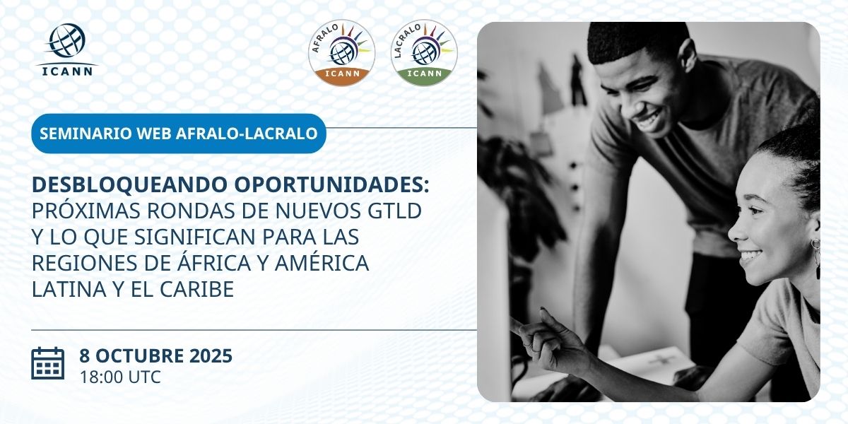[[-- Translated text (en -> es) --]] ** Por favor regístrate y comparte esta invitación entre tus ALS y miembros ** Registro de Zoom: https://icann.zoom.us/webinar/register/WN_AtnYSH9BST2n994MH8pHvg [icann.zoom.us] <https://urldefense.com/v3/__https:/icann.zoom.us/webinar/register/WN_AtnYSH9...> Interpretación en inglés, francés, español, árabe y portugués Estimados, Invitación para asistir al seminario web conjunto AFRALO-LACRALO “Desbloqueando oportunidades: Próximas rondas de nuevos gTLD y lo que significan para las regiones de África y América Latina y el Caribe” el miércoles 8 de octubre de 2025 de 18:00 a 20:00 UTC. Este seminario web pretende ser informativo, de concientización y educativo sobre la próxima ronda de nuevos gTLD, el Programa de Apoyo al Solicitante (PAS) y la asistencia brindada para brindar apoyo a las comunidades desatendidas. Además, el seminario web presentará casos prácticos regionales que describen la historia de un TLD, incluyendo sus antecedentes y objetivos comerciales. Invitación al seminario web conjunto AFRALO-LACRALO « Explotar las oportunidades: Prochaines séries de nouveaux gTLD et leurs implications pour les régions Afrique et Amérique latine et Caraïbes » le mercredi 8 de octubre de 2025 de 18h00 a 20h00 UTC. Este seminario web tiene información, educación y sensibilización sobre las cadenas de la serie de nuevos gTLD, el Programa de apoyo a los candidatos (PSC) y la ayuda proporcionada a las comunidades mal merecedas. Los estudios de casos regionales específicos presentan también la historia de un TLD, su contexto y sus objetivos comerciales. Agenda: https://icann-community.atlassian.net/wiki/x/AQATHg [icann-community.atlassian.net] <https://urldefense.com/v3/__https:/icann-community.atlassian.net/wiki/x/AQAT...> Registro de Zoom: https://icann.zoom.us/webinar/register/WN_AtnYSH9BST2n994MH8pHvg [icann.zoom.us] <https://urldefense.com/v3/__https:/icann.zoom.us/webinar/register/WN_AtnYSH9...> Interpretación: inglés, francés, español, árabe y portugués Importante: tenga en cuenta la sala de zoom, ya que se le enviará un enlace único. Gracias. Atentamente, Personal general Personal de políticas de la ICANN en apoyo a la comunidad At-Large www.icann.org<http://www.icann.org>