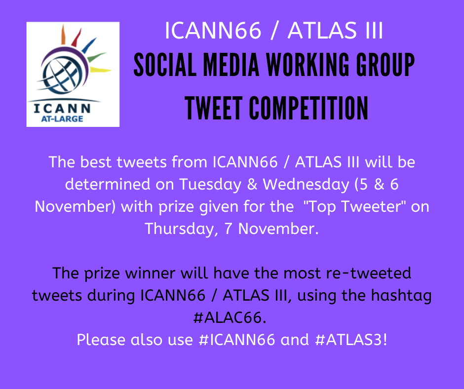 ---------- Forwarded message --------- From: Evin Erdogdu <evin.erdogdu@icann.org> Date: Tue, Nov 5, 2019 at 7:21 AM Subject: [social-media-wg] Today & Tomorrow - SMWG Tweet Competition To: social-media-wg@atlarge-lists.icann.org < social-media-wg@atlarge-lists.icann.org> Hello SMWG Members, Retweet & share - tweet competition during ICANN66 / ATLAS III starting today & tomorrow - winner announced on Thursday! Use hashtag *#ALAC66* to join the competition (as well as #ICANN66 and #ATLAS3). See the flyer attached, and please share in your networks. Best, Evin _______________________________________________ Social-media-WG mailing list Social-media-WG@atlarge-lists.icann.org https://mm.icann.org/mailman/listinfo/social-media-wg _______________________________________________ By submitting your personal data, you consent to the processing of your personal data for purposes of subscribing to this mailing list accordance with the ICANN Privacy Policy (https://www.icann.org/privacy/policy) and the website Terms of Service (https://www.icann.org/privacy/tos). You can visit the Mailman link above to change your membership status or configuration, including unsubscribing, setting digest-style delivery or disabling delivery altogether (e.g., for a vacation), and so on.