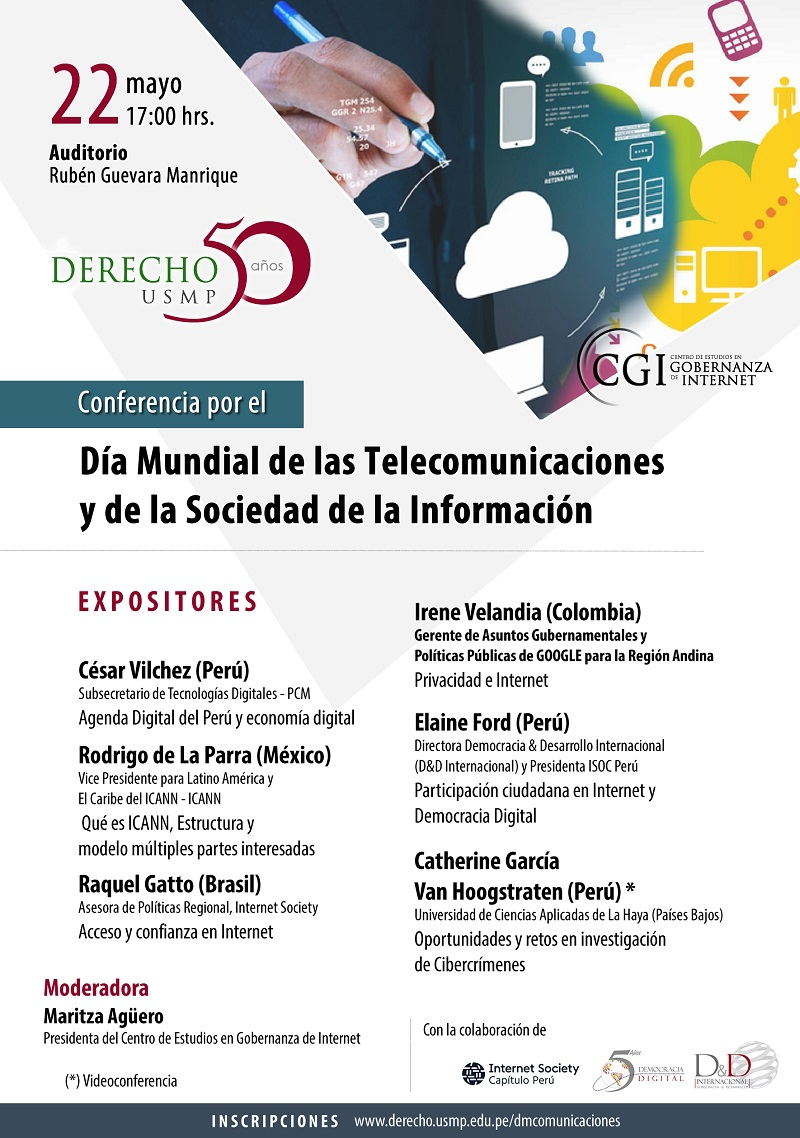 Previo saludo, el motivo del presente correo es para invitarlos a participar en la conferencia por el "Día Internacional de las Telecomunicaciones y de la Sociedad de la Información", el cual contará con la participación de los representantes, entre otros, de GOOGLE, ICANN, Internet Society, PCM y Democracia &Desarrollo Internacional (D&D Internacional).