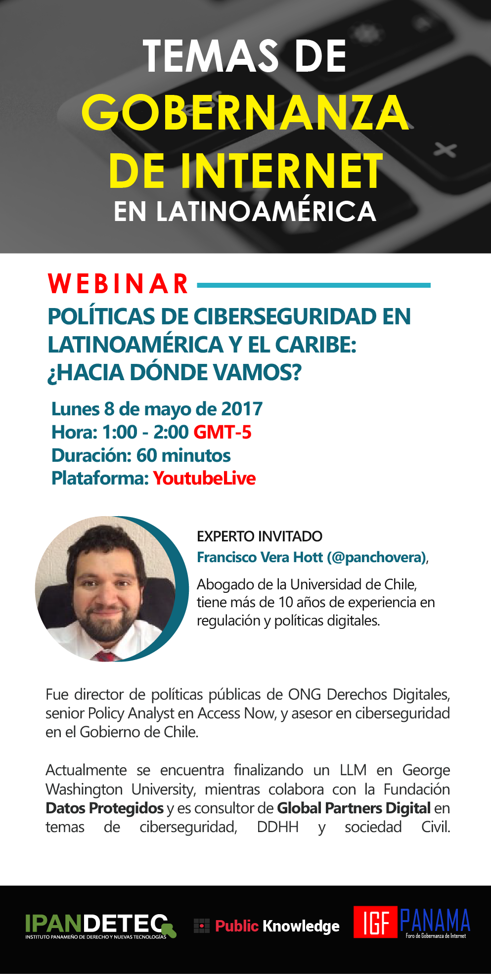 Queremos invitarlos desde IPANDETEC a nuestra siguiente webinar en colaboracon con publicknwoledge con Franccisco Vera abogado de la universidad de Chile . Antiguo director de derechos digitales , senior policy analyses de accesnow y asesor de cyberseguridad del gobierno chileno. Actualmente cruzando un LLM en George Washington University al mismo tiempo colabora con la ong datos protegidos y ademas es asesor de GLOBAL PARTNER DIGITAL en materias de DDHH , cybersec y y sociedad civil. Sera el lunes 8 de mayo en un youtube live ,