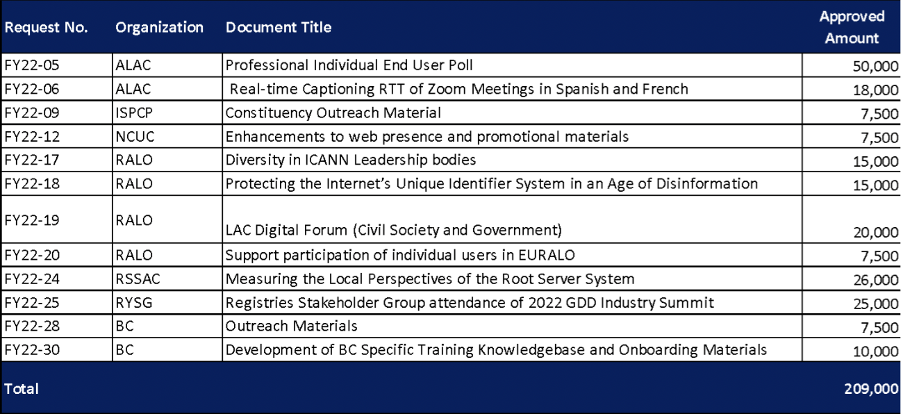 ICANN published the Budget that will be approved later this month by the Board. Below are the ABRs that were included. If you recall other ABRs that we had in the past went into the core budget such as RTT in English and the RALO Discretionary fund as well as funding for communications.