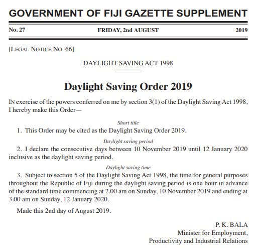 Today Raymond Kumar reported the Government of Fiji Gazette Supplement No. 27 +# (2019-08-02) said that Fiji observes DST