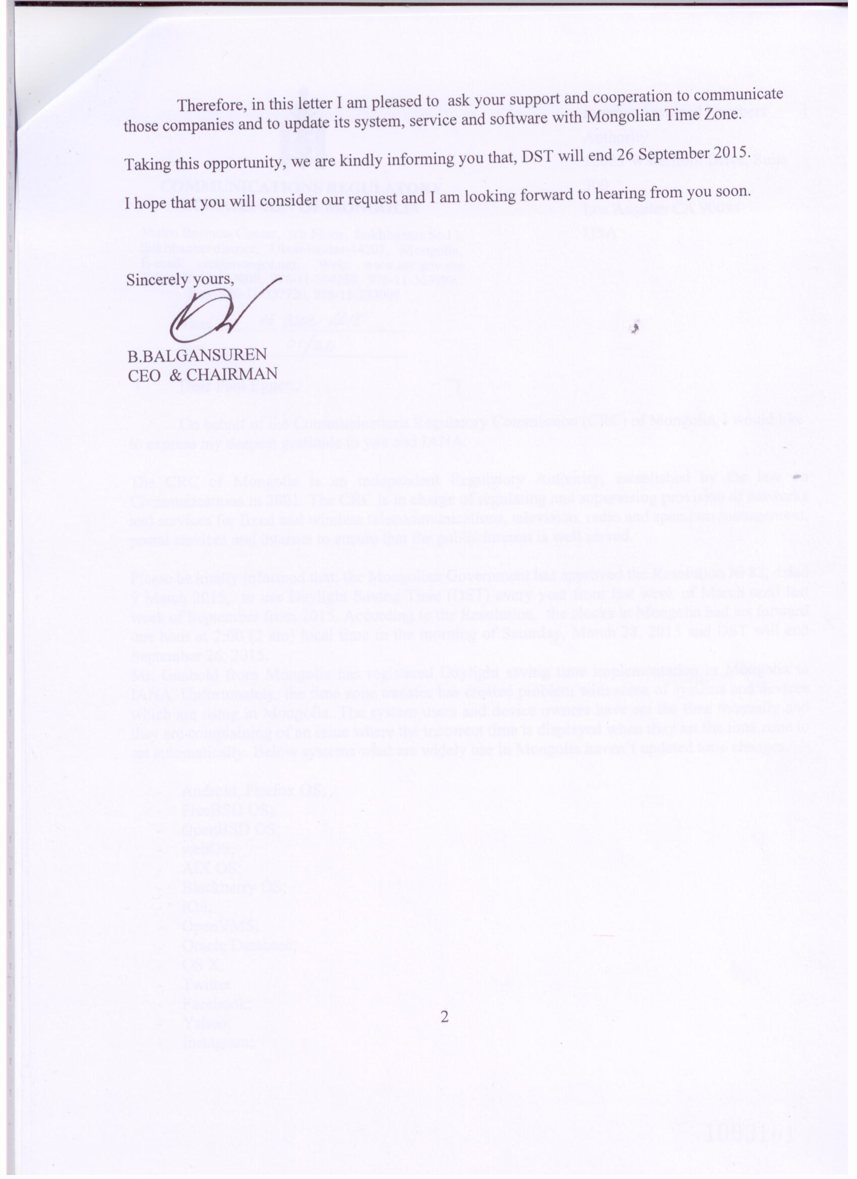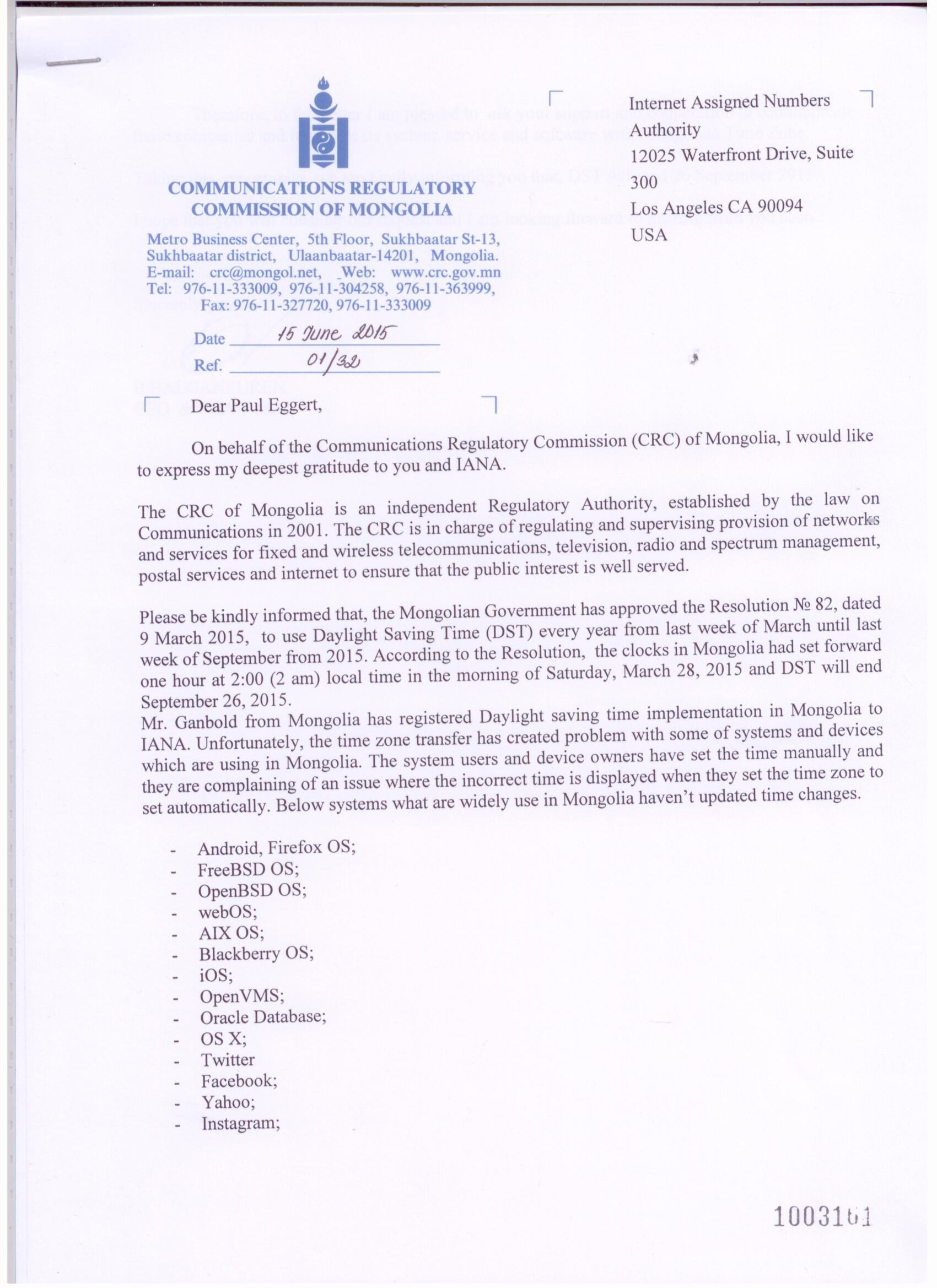 Dear Paul Eggert, Greetings from Mongolia. I am writing this letter on behalf of the Communications Regulatory Commission of Mongolia. The Mongolian Government has approved the Resolution ? 82, dated 09 March 2015, to use Daylight Saving Time (DST) every year from last week of March until last week of September from 2015. According to the Resolution, the clocks in Mongolia has set forward one hour at 2 : 00 (2 am) local time. Unfortunately, some of system, service and software which are widely using in Mongolia have not updated their time zone. Regarding this issue, the CRC has sent you official letter dated 15th June 2015 to you for your support on above mentioned issue and we have not received any response from you yet. Here I attached the copy of letter. Thank you for your understanding. I look forward hearing from you soon. BR, Amgalan Ts. (Ms) Foreign Relation Officer, Legal, Information and Administration Dept, CRC of Mongolia. mobile: 976 91112268 phone: 976 11 304258,304257 fax:976 11 327720 e-mail: amgalants@crc.gov.mn<mailto:amgalants@crc.gov.mn>