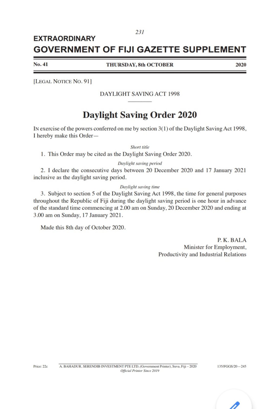 Hi Paul Please find attached gazette for DST changes in Fiji. It is from December 20th 2020, till 17th January 2021. Thanks Raymond Kumar Head of Billing & Products +6797015315 ________________________________ Notice of Confidentiality: The information contained in this communication is intended solely for the use of the individual or entity to whom it is addressed and others authorized to receive it. It may contain confidential or legally privileged information. If you are not the intended recipient you are hereby notified that any disclosure, copying, distribution or taking any action in reliance on the contents of this information is strictly prohibited and may be unlawful. If you have received this communication in error, please notify us immediately by responding to this email and then delete it from your system.