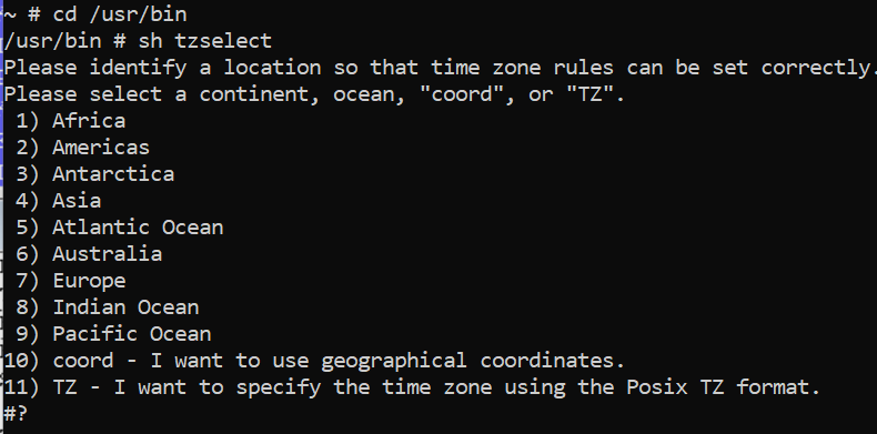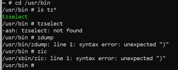 ~ # cd /usr/bin /usr/bin# ls tz* tzselect -ash: tzselect: not found /usr/bin # zdump > /usr/bin/zdump: line 1: syntax error: unexpected ")"> /usr/bin # zic /usr/sbin/zic: line 1: syntax error: unexpected ")"