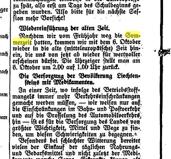 In the year 2013 I had contributed information that Swiss neighbor country Liechtenstein, represented by Europe/Vaduz in file backzone, did not have daylight saving time in 1941 and 1942, while Switzerland, represented by Europe/Zurich, did have it. A colleague sent me a follow-up question today, which cause me to reconsider the question. I was able to access the online archive of the Vaduz paper Vaterland for free - they offer a special summer deal. I could confirm frm the paper that Liechtenstein did in fact follow the same DST in 1941 and 1942 as Switzerland did. The entry Europe/Vaduz in the file backzone can be removed, so that the link Europe/Zurich Europe/Vaduz remains effective even for those who, like me, compile TZ with backzone included. I attach a few newspaper clippings, not translated.