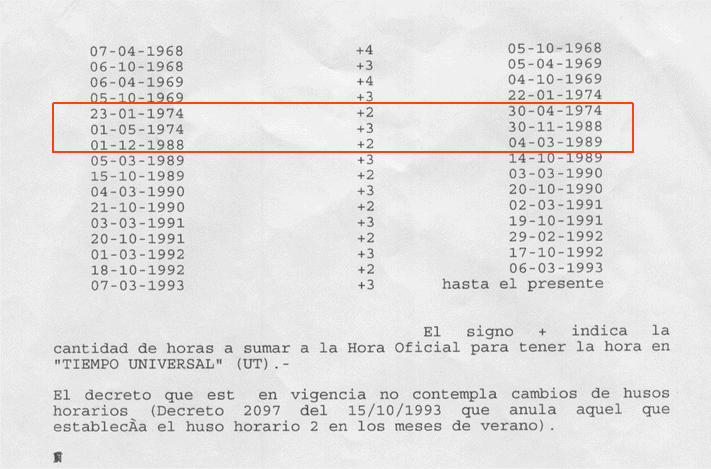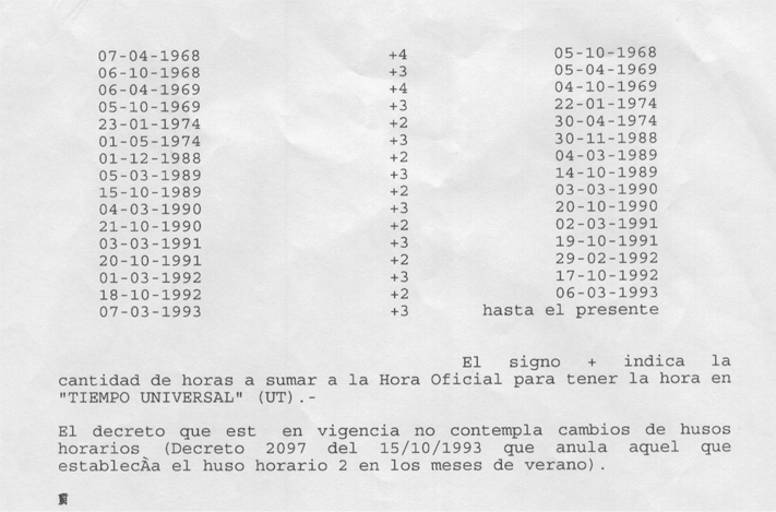 If you take a look at your data, Argentina have some DST periods from 1975 to 1987, but according to the Naval Observatory official data (and these have a total acceptance by the argentine astrologers), there was no time changes in these years, as shown below: Elsie data from tzdata2001d.tar.gz (with coincidence to Shanks data and his International Atlas): Rule Arg 1974 only - Jan 23 0:00 1:00 S Rule Arg 1974 only - May 1 0:00 0 - Rule Arg 1974 1976 - Oct Sun>=1 0:00 1:00 S Rule Arg 1975 1977 - Apr Sun>=1 0:00 0 - Rule Arg 1985 only - Nov 2 0:00 1:00 S Rule Arg 1986 only - Mar 14 0:00 0 - Rule Arg 1986 1987 - Oct 25 0:00 1:00 S Rule Arg 1987 only - Feb 13 0:00 0 - Rule Arg 1988 only - Feb 7 0:00 0 - Rule Arg 1988 only - Dec 1 0:00 1:00 S However, at the Naval Observatory of Buenos Aires report we have for the same range of time: It's an official document from Argentina Naval Army, and I am quite totally sure those data are 100% trustful... I really hope this info could be useful for your very good job!! Have a nice day! From: Dra. Amelia Urbina draurbina@arnet.com.ar <mailto:draurbina@arnet.com.ar> Ptolomeo Mailing List of Astrologers ptolomeo@activanet.es <mailto:ptolomeo@activanet.es> Zodiac - Astrology Software for Windows <mailto:astrix@zodiacwin.com> astrix@zodiacwin.com <http://www.zodiacwin.com/dream/dream6.htm> GuestBook - Opiniones - Opiniões <http://www.zodiacwin.com/> _____ English Support: <mailto:english@zodiacwin.com> english@zodiacwin.com Soporte en Español: <mailto:astrix@zodiacwin.com> astrix@zodiacwin.com Suporte em Português: <mailto:brasil@zodiacwin.com> brasil@zodiacwin.com _____ <https://server25.hypermart.net/maxxie/secureordersssl/orderng.htm> If you want to purchase Zodiac -> Prices, Options and Order Form <https://server25.hypermart.net/maxxie/secureordersssl/orderspanish.htm> Si desea Adquirir Zodiac -> Precios, Opciones y Orden de Compra <https://server25.hypermart.net/maxxie/secureordersssl/orderbr.htm> Se deseja adquirir Zodiac -> Preços, Opções e Ordem de Compra _____ <https://server25.hypermart.net/maxxie/down/formdm3ng.htm> Download Demo and/or Last Update <https://server25.hypermart.net/maxxie/down/formdm3es.htm> Descarga Demo y/o Ultima Actualizacion <https://server25.hypermart.net/maxxie/down/formdm3br.htm> Download Demo e/ou Atualizaçao Mais Recente _____ <mailto:astrix@zodiacwin.com?subject=Inform me of future updates> Inform me - Informeme - Quero ser Informado _____ <mailto:astrix@zodiacwin.com?subject=Remove> No more emails - No recibir mas emails - Não mais receber emails _____ Este mensaje, por soporte internacional, no tiene acentos.