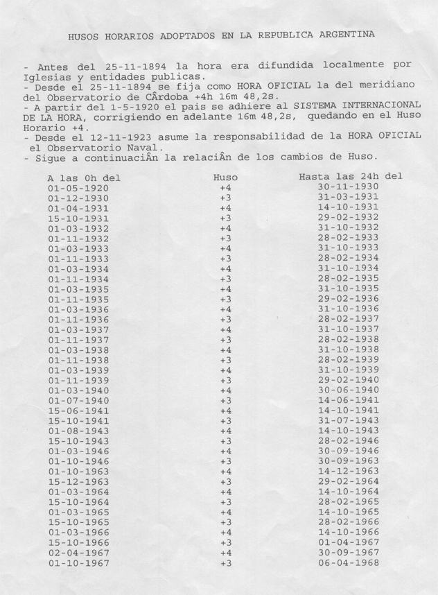 Another thing about the data of Argentina Time Zones, the data I send the other day is applicable to the Buenos Aires Region, but in Argentine there is more zones, but in the period of the errors in Elsie, Shanks and Astrodienst data 1974-1988 all the Argentina Times Zones Are EQUAL - in the data of Elsie, Shanks and Astrodienst also there is not differences between the different regions in this period -... Sorry, Elsie, Shanks and Astrodients, my only intention is help to correct an error that carries many years in yours databases, all for make the world of astrology much precise... I consult very much astrologers of argentina and all are sure between 1975 to 1987 There was not Dyalight Saving or another change in the official hour in Argentina, the Naval Observatory of Buenos Aires - is the office of the Argentina Government that makes the change of hours of the country - also told the same, because this I am almost totally sure the data in the email of yesterday is correct... And because this decided to send the data to your emails... Good Luck and Good Day... Javier Reinoso... From: Dra. Amelia Urbina draurbina@arnet.com.ar Ptolomeo Mailing List of Astrologers ptolomeo@activanet.es Zodiac - Astrology Software for Windows astrix@zodiacwin.com ----- Original Message ----- From: Astrix Zodiac To: tz@elsie.nci.nih.gov ; webmaster@astro.com Sent: Wednesday, January 09, 2002 11:28 PM Subject: Errors in Data of Shanks and Elsie about the Argentina Time Zones Hello... At first, thank you for your work. It is very important for us, astrologers. We decided to write you because we made part of an astrological discussion group called Ptolomeo. Some people wrote asking about Argentina timezones few weeks ago and all of the argentine astrologers told that 'Shanks, Elsie data and other english sources have errors'. So, Dra. Amelia Urbina, member of the group, has contacted the Naval Observatory of Buenos Aires and she got the following results. Please see the next images: