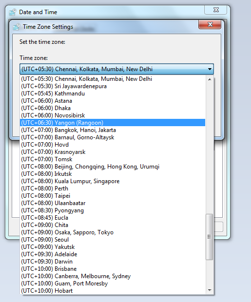 Hi All, We wanted to implement timezone support from our web interface where user should be able to select timezone in the following UTC format similar to windows 7 OS. Is it possible to fetch records for timezone from tz database in following UTC format to construct timezone drop down? if yes then how can we set timezone in UTC format like *set timezone UTC+05:30 Chennai,Kolkata,Mumbai,New Delhi* Thanks, KAILASH KUMAR JAIN BE cs Post at: kailashkumarp@gmail.com Legal Warning: This message may contain privileged and confidential information. If you are not the intended recipient or for any reason think that this message may have been address to you or reached you as a mistake, its requested that you must not disseminate,copy or take any action in reliance on it and I ask you to delete all copies from your mail box and computer system and also notify me immediately by return e-mail.