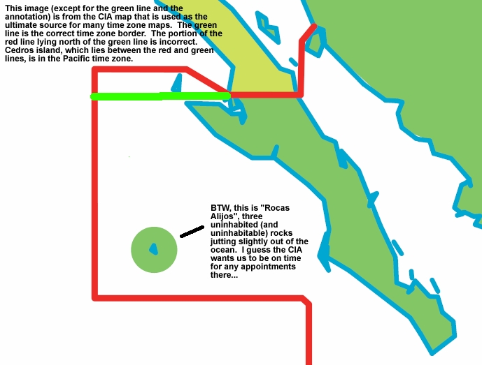 That map, and the maps it was derived from (including the original source, the CIA) show Cedros Island as being UTC-7 (as if it were in Baja Sur, not Baja). The border between Baja and Baja Sur is on the 28th parallel, which lies south of Cedros Island. Baja is in the Pacific Time zone, UTC-8. Baja Sur is in the Mountain time zone, UTC-7. I find multiple references confirming that Cedros Island is part of Baja, thus UTC-8. I find no references making any allusion to the official or unofficial observed time on the island to be other than UTC-8. This seems to be a significant error, not I presume the type the CIA normally makes... so I am wondering if I've missed something. Thoughts? Regards, Steve Jones, St. Louis, MO Emacs!