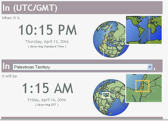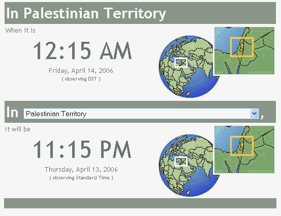 www.worldtimeserver.com doesn't show the current DST rules, however, it's time zone converter does allow for peaking into the rules behind. The claim is therefore (see attached two screenshots) that the Palestinian Territory entered DST precisely one week before, Friday the 14.th. of April at 0:00. One of the screen shots will show you the unbelievable claim that at 0:15 the 14.th. of April in the Palestinian Territory, it was 23:15 the 13.th. of April in the Palestinian Territory - but even Einstein would not have been able to mingle his relativity theory so much (using for instance the speed of light), that he could go back in time. Back to the future? I think an equal time or better an error message would have been more appropriate. The question is if anyone can confirm that the DST change happened a week before. To me it sounds plausible, but we would like some (more) authoritative information. Regards, Jesper Nørgaard Welen Email: jnorgard@Prodigy.Net.mx Project Leader (Líder de Proyecto) Software CIMMYT - Centro Internacional de Mejoramiento de Maíz y Trigo Dirección: CIMMYT Int. c/o Jesper Nørgaard Km. 45, Carretera México-Veracruz El Batán Texcoco, Edo. de México CP 56130 MEXICO Tel.: +52 (55) 58-04-20-04 ext. 1374 Fax: +52 (55) 58-04-75-58 Tel. Casa: 53-10-05-95 ó 53-10-97-78 Download the free program World Time Explorer, I made: http://www.worldtimeexplorer.com/index.html