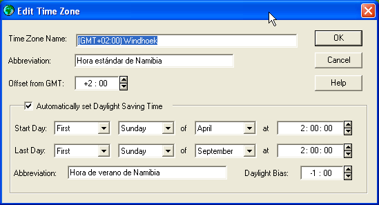 John Gray, thanks for the quick feedback. Concerning problems in 2009 I think that many people loading the timezone updates in 2007 will not do so in 2009 if there were no actual rule changes since - so I recommend getting it right now. Namibia: I must admit I had not seen the -1.00 in Daylight Bias: My first comment is: this will work technically, as you claim! But is it the best way to do it? Actually "hora de verano de Namibia" means "summertime of Namibia", which will apply between April and September. Note that this use of summertime/wintertime is opposite to all other countries (I think) and also to the web links you sent. However, when you look it up in the list, all other countries are also listed for their wintertime, the GMT offset when not applying DST. Putting Windhoek as (GMT+02:00) is therefore a bit like reporting the revenue of 250 companies before tax, and 1 company after tax - it is just impractical for most purposes. Therefore if you want to call the period something different, for instance calling it summertime between April and September, better do the change only in the Abbreviations, so that Time Zone Name is (GMT+01:00) Windhoek, Abbreviation(1) is "Namibia summertime", Offset from GMT is +1:00, Start Day and Last Day are inversed, Daylight Bias is +1:00 and Abbreviation(2) is "Namibia wintertime". This will confuse less people, I think. Regards, - Jesper Nørgaard Welen