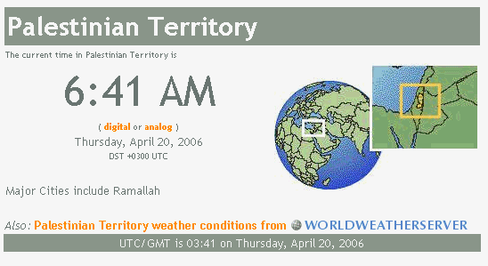 I checked www.worldtimeserver.com recently and most of the recent changes to the tz database are in line with this server, it seems to be fairly well up-dated in timezone matters (unlike wikipedia, for instance!). This goes for Haiti, Tunisia, Sri Lanka, Irana, and Georgia to mention a few. Therefore I was surprised to see that they have UTC+3 at the moment for Palestinian Territory, when tz database will first have Gaza to enter DST in approximately 18 hours. This could be because they think that it follows Israel time, but it might be because they learned something more about Gaza/West Bank. Does anyone have information if Gaza/West Bank in fact applied DST before expected or not? Regards, - Jesper Jesper Nørgaard Welen Email: jnorgard@Prodigy.Net.mx Project Leader (Líder de Proyecto) Software CIMMYT - Centro Internacional de Mejoramiento de Maíz y Trigo Dirección: CIMMYT Int. c/o Jesper Nørgaard Km. 45, Carretera México-Veracruz El Batán Texcoco, Edo. de México CP 56130 MEXICO Tel.: +52 (55) 58-04-20-04 ext. 1374 Fax: +52 (55) 58-04-75-58 Tel. Casa: 53-10-05-95 ó 53-10-97-78 Download the free program World Time Explorer, I made: http://www.worldtimeexplorer.com/index.html